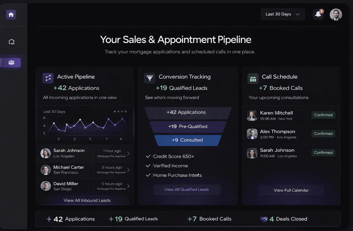 Monitor your entire pipeline in one place from incoming leads to qualified applicants and booked calls.